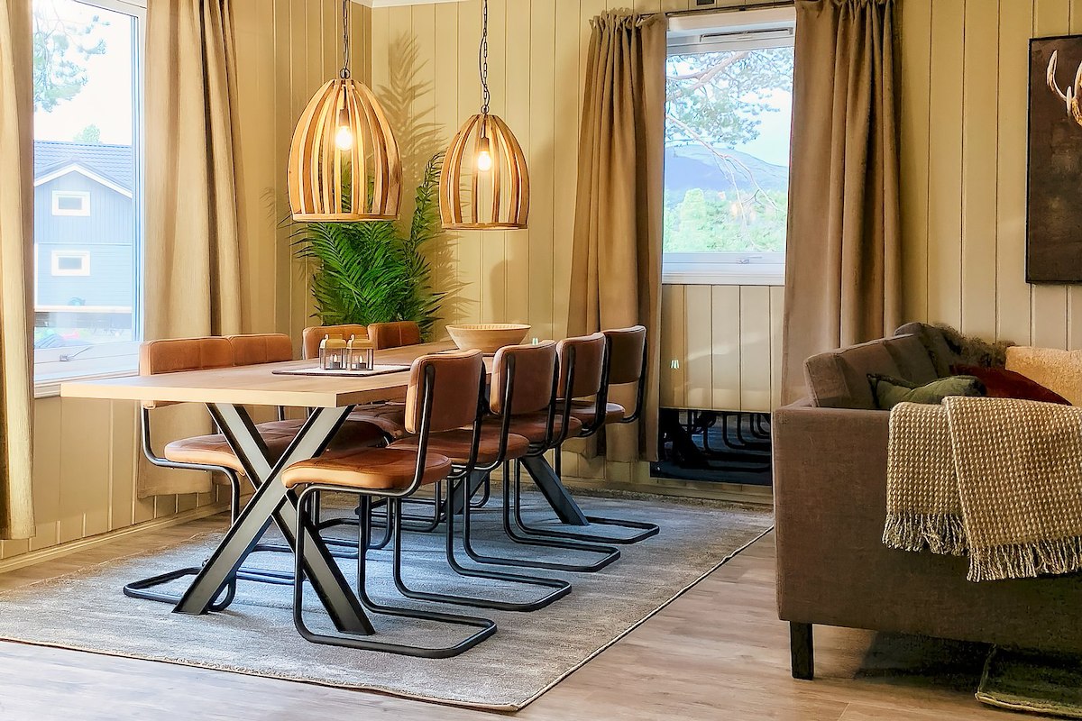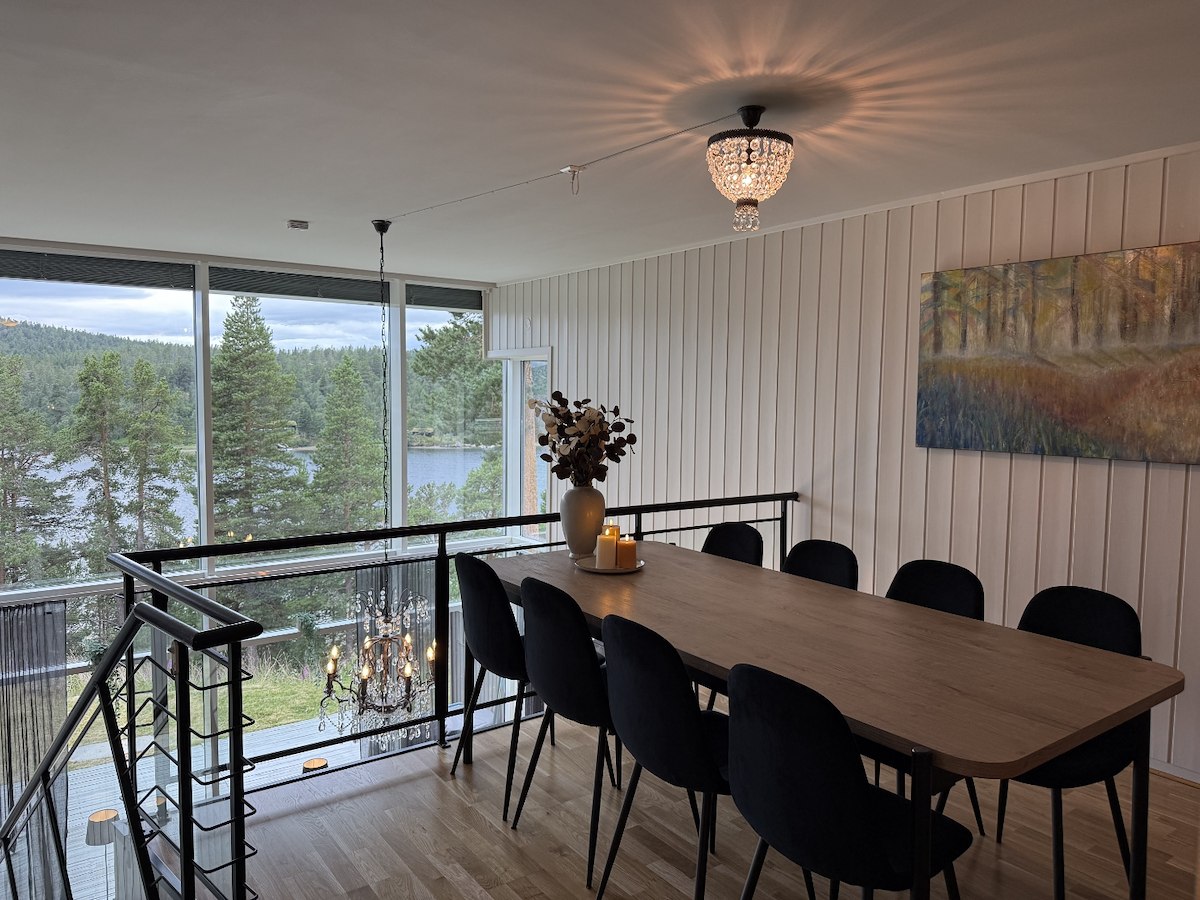 Modern cabin of 180 m2, 10-14 beds and a panoramic view of lake Savalen. Centrally located with walking distance to all activities. 5 bedrooms: 1 with double bed 180*200 cm, 4 rooms with family bunk beds 75/120/200 cm. 2 bathrooms with shower and toilet, one with a jacuzzi. Wardrobe. Washroom (underfloor heating). Open kitchen solution. Large dining area connected to a large living room. Large terrace with good sunny conditions and a nice view of the lake Savalen.