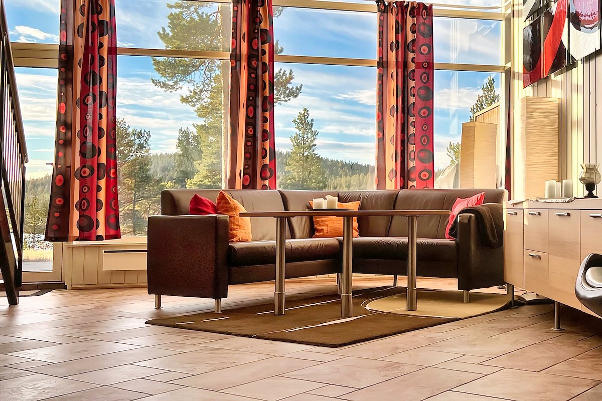 Large suite over two floors. with a large glass facade overlooking the Savalen. 2nd floor: Entrance hall, kitchen, bathroom with shower and toilet, bedroom with double bed 180*200 cm and bunk bed 75*200 cm. 1st floor: Living room with a view, double bed 180*200 cm, fireplace, 55 inch flat screen. Bathroom with jacuzzi, shower and toilet. Sauna. Bedroom with double bed 180*200 cm and bunk bed 75*200 cm. Parquet floor. Total beds for 10 people.