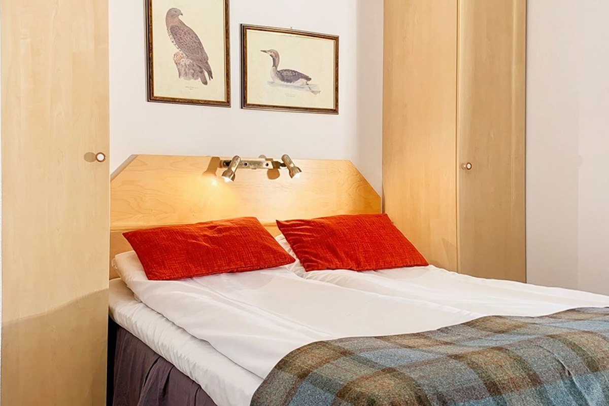 2 bedrooms with double beds, 150*200 cm on the 2nd floor and 160*200 cm on the 3rd floor. 2 bathrooms with shower and toilet. One bedroom with a view of the lake Savalen, the other bedroom with a view out through a mirrored glass window to the common hallway. Balcony with a south/west view over the lake Savalen.